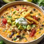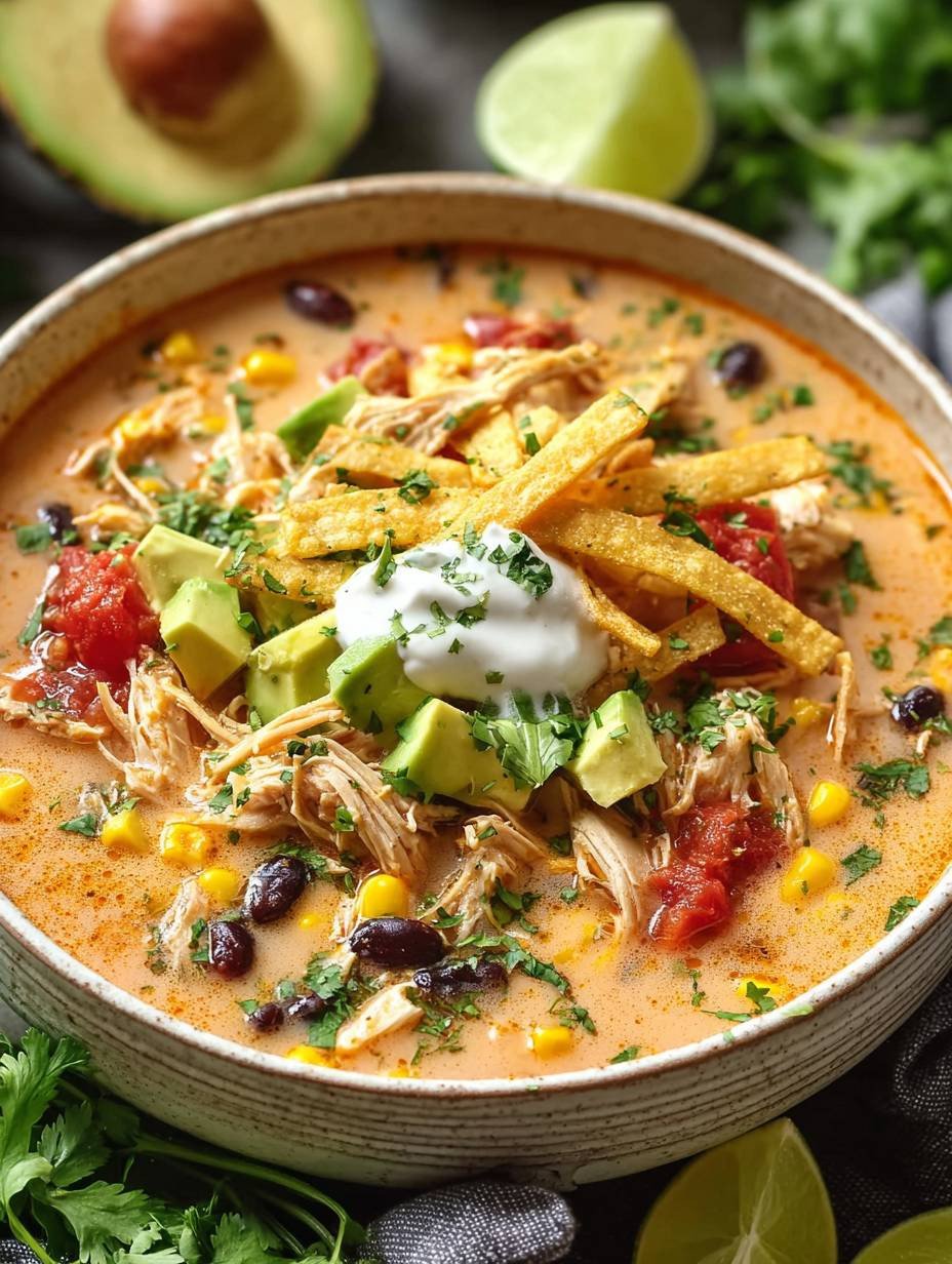 Imagine a bowl of pure comfort, where tender chicken mingles with the vibrant colors of diced tomatoes, sweet corn, and hearty black beans, all swimming in a rich, creamy broth that wraps around you like a warm hug. The crunch of tortilla strips adds just the right amount of texture, while a sprinkle of fresh cilantro lifts every spoonful into the realm of culinary bliss.