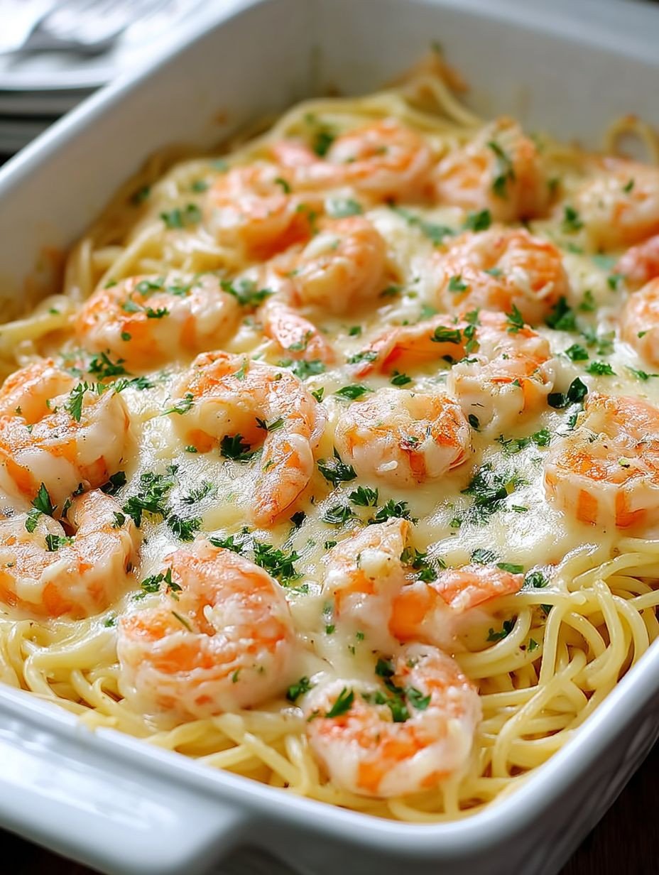 This baked pasta dish features tender shrimp nestled among strands of spaghetti, all coated in a rich, savory garlic-lemon butter sauce. A creamy element is introduced, and the entire dish is topped with melted cheese and fresh parsley, creating a comforting and flavorful meal with a golden finish from the oven.