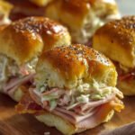 These baked sliders offer a delightful combination of savory flavors and satisfying textures. Tender slices of turkey and turkey ham are layered with crisp turkey bacon and a creamy, tangy coleslaw, all nestled within soft slider buns. Brushed with a savory butter topping and baked until golden, these sliders present a warm, inviting appetizer or light meal with a harmonious blend of ingredients.